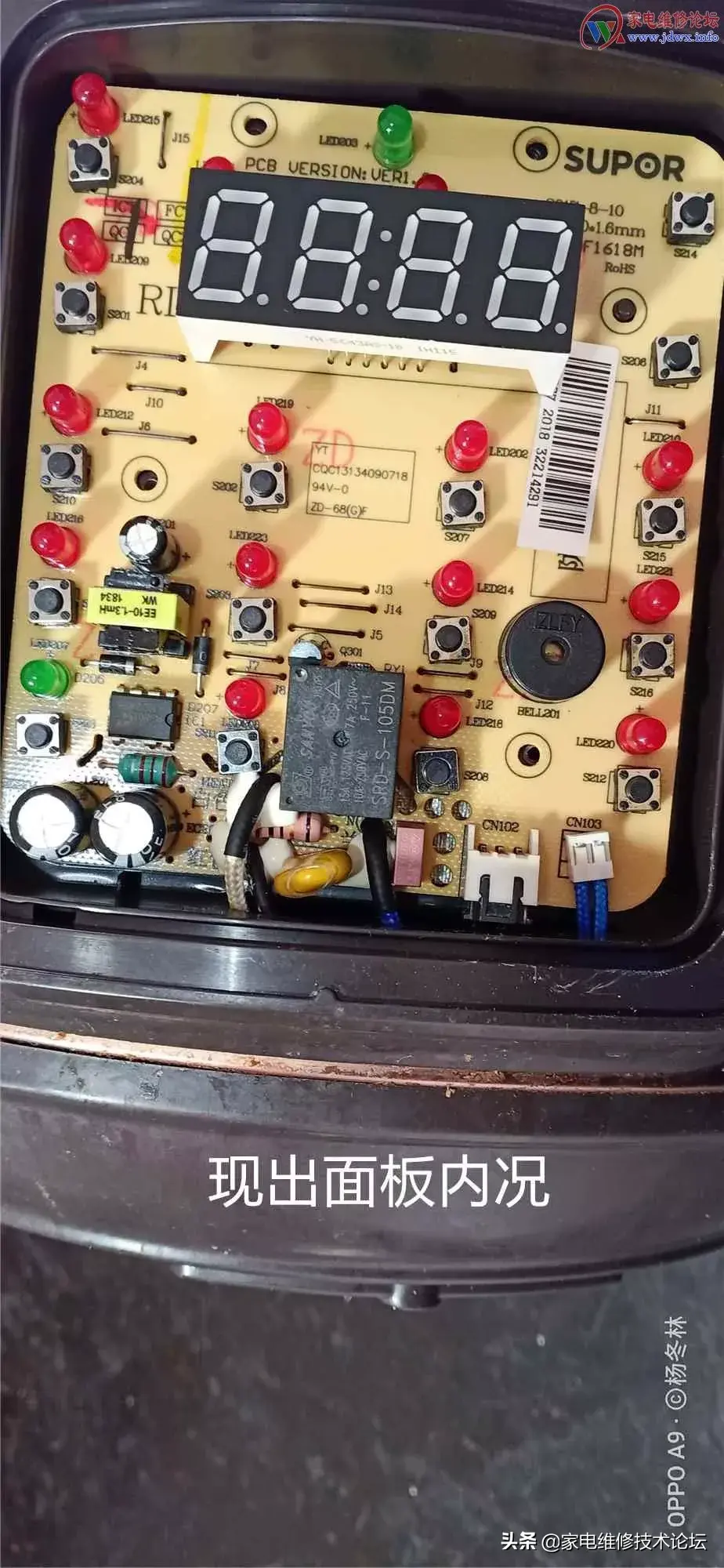 由于这种电压力锅电路板装在面板上,所以要先揭开面板模,才能取出电路板: