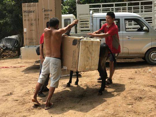 京东618大促后,位于横断山脉腹地的德昌一村庄,京东大家电配送员将冰箱运到村庄后发现,有一段路车辆无法通行。于是,客户直接从家里拉来了一辆木牛流马,和两位配送员合力,经过30分钟,将冰箱送入家中。