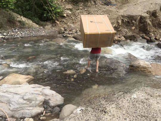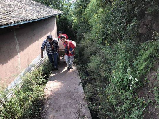 给横断山脉地区农村送货最常见的一种情况是,“最后一百米”车辆无法直达,只能通过配送员肩扛背挑的将商品运到家里。或许大多数生长在农村的青年,也曾经见过老一辈们,用几乎同样的方式,把大米、蔬菜、土豆背回家。