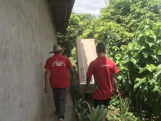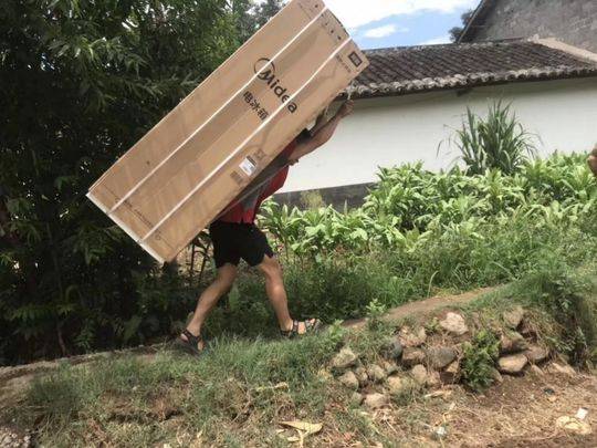 云南省的京东家电专卖店配送员用起重机将冰箱吊到客户家里,可没有起重机的农村,如果冰箱进不了大门,怎么样才能把冰箱运到家里呢?