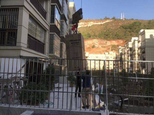 宜宾白花镇的客户和配送员就地取材,找来了一个梯子,众人将梯子扶稳,配送员扛起来往上爬,阳台上的几个大汉看到冰箱被抬上来,使劲抓牢,“众人拾柴火焰高”,冰箱安安全全地放到家里了。