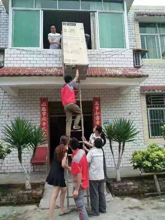 在中国的很多小县城,有些居民自建楼或者小区,楼梯狭小,大号家电比如双开门大号冰箱就没法搬上门。于是,京东大家电的配送员和顾客就想了很多办法。在云南省巧家县的一户人家,配送员和客户一起叫来了一辆大型起重机,硬生生把一台大号冰箱吊到了5楼阳台入口,搬到了家里。