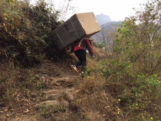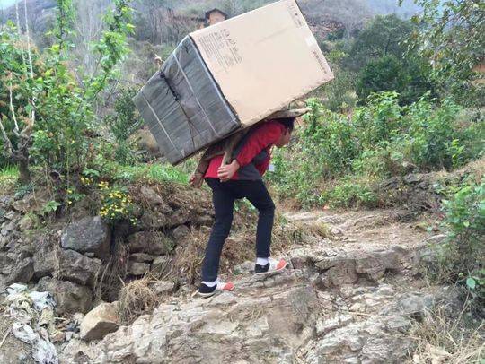 这给京东配送员带来了很大挑战,有时候车辆到山下,配送员就需要肩扛背挑的将商品运到客户家里,上山的路,有时候甚至不敢叫“路”。他们常常自己调侃自己,“身上负重200斤,没有一身好‘轻功’可不行”。
