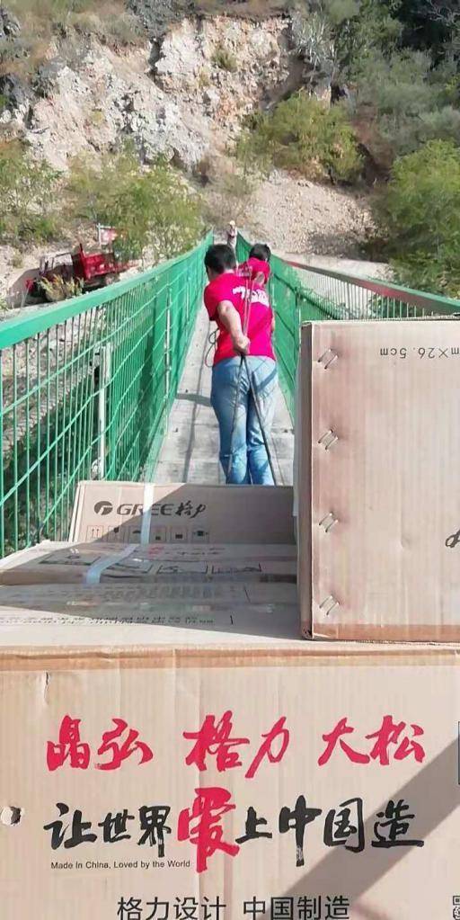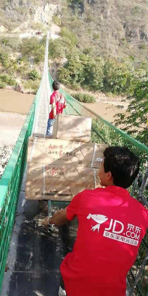 在通往玉溪市元江县乡村的路上,需要经过这样的大桥。它建在江河之上,是沟通村里与外面世界的唯一通道。因为桥面较窄,给这里运输冰箱等大家电就是一件比较“头疼”的事。对于京东家电专卖店的配送小哥来说,遇到任何的困难都有解决的办法,无法开车运输?那就两个人合力拉过桥!
