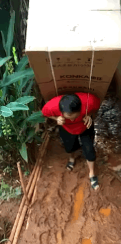 每年的夏季,位于长江上游的四川省泸州市,将迎来雨季。而一旦下雨,山区偏远农村的泥泞小路将是对车辆运输最大的阻碍。下图就是真实写照,由于下雨天烂泥多,配送员不得不停下车,背起来送货。