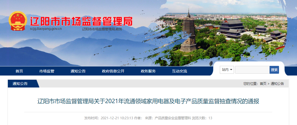 中国质量新闻网讯 2021年12月21日,辽宁省辽阳市市场监督管理局网站通报2021年流通领域家用电器产品质量监督抽查情况。本次抽查家用电器10批次,经检验,1批次产品不合格,抽样合格率90%。