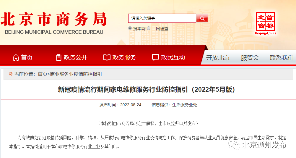 为有效防范新冠疫情传播风险,科学、精准、从严做好家电维修服务行业疫情防控工作,保护消费者与从业人员健康安全,满足市民生活需求,北京市商务局发布了新冠疫情流行期间家电维修服务行业防控指引。