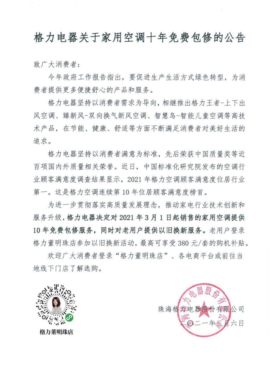 3月6日,格力电器发布公告,宣布对2021年3月1日起销售的家用空调实行“十年包修政策”,从更大程度上保障消费者利益。这是迄今为止中国家用空调行业承诺的最长包修期,也是自2005年格力率先在行业推出"家用空调6年免费包修"政策以来对服务品质的再升级。