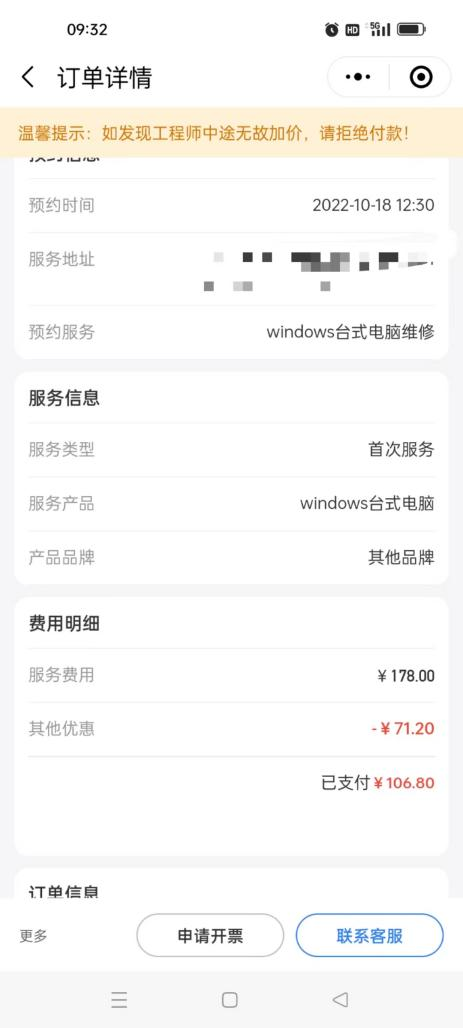 但啄木鸟维修人员却告知赵阿姨,虽然没有维修、也没有更换电源,上门检测费按规定仍须收178元,不过他向公司申请了优惠,收106.8元即可。