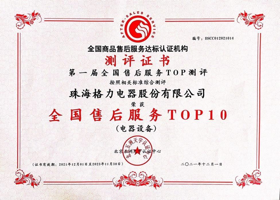 2021年12月22日,由中国商业联合会主办的“第十届全国售后服务评价暨标准宣贯活动”在海南博鳌举行。格力电器凭借完善的服务流程体系、高效专业的服务质量,荣获“全国国标五星级售后服务企业”、“全国售后服务TOP10”两大荣誉。