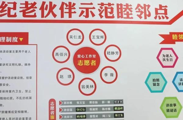 过程中,他老伴嵇静芳还成了一名老伙伴志愿者。6年多来,这里成了老人们欢聚的地方,每逢佳节,大家在一起包汤圆、包粽子、糚年糕、过生日、唱党歌……十分开心。这里还曾被评为“上海市社区老年人示范睦邻点”。97岁的沈祥书老人每年都在这里和大家一起过生日,一个劲地夸赞“共产党好、社会主义好”!