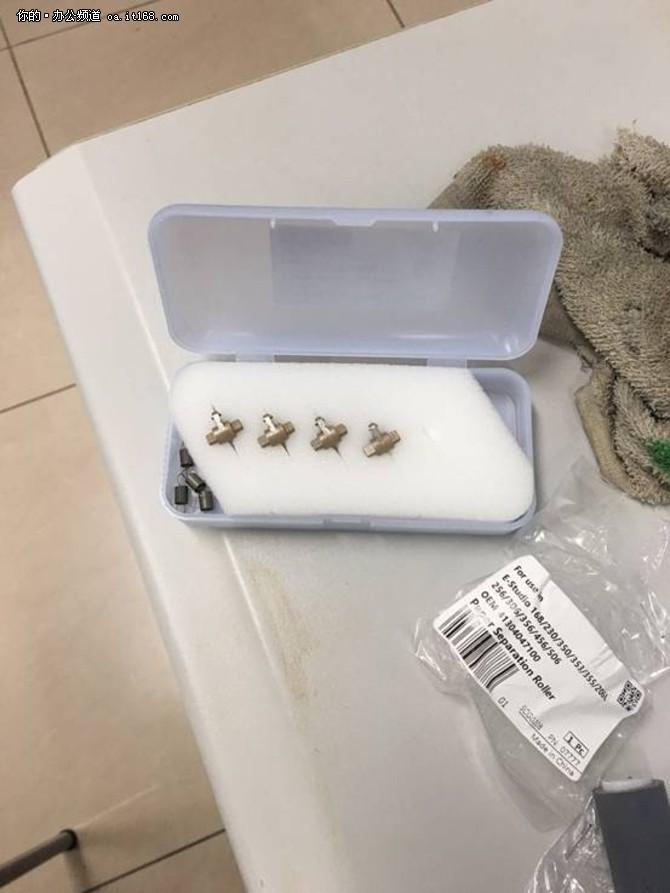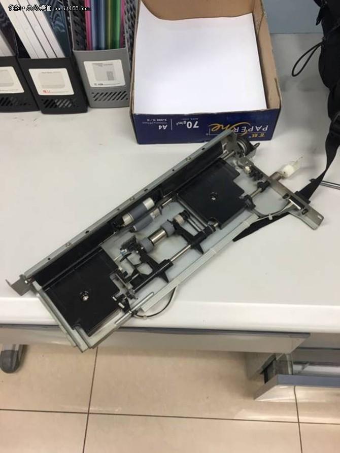 第二次上门更换进纸盒搓纸轮,定影分离爪。首先进行设备打印测试,确保设备没有别的异常问题,然后断电,拆开机器外壳,取出进纸总成,拆开定影单元,取出搓纸轮 更换新的配件整个更换维修为60分钟。