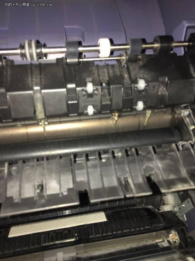 第一次上门故障维修检查,主要排除了其他问题引起的异响和不工作,最终通过检查判断为进纸搓纸轮磨损、定影分离爪缺失导致的故障。