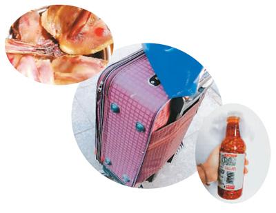 图为小叶母亲给她装的行李箱和里面的板鸭、剁椒酱。
