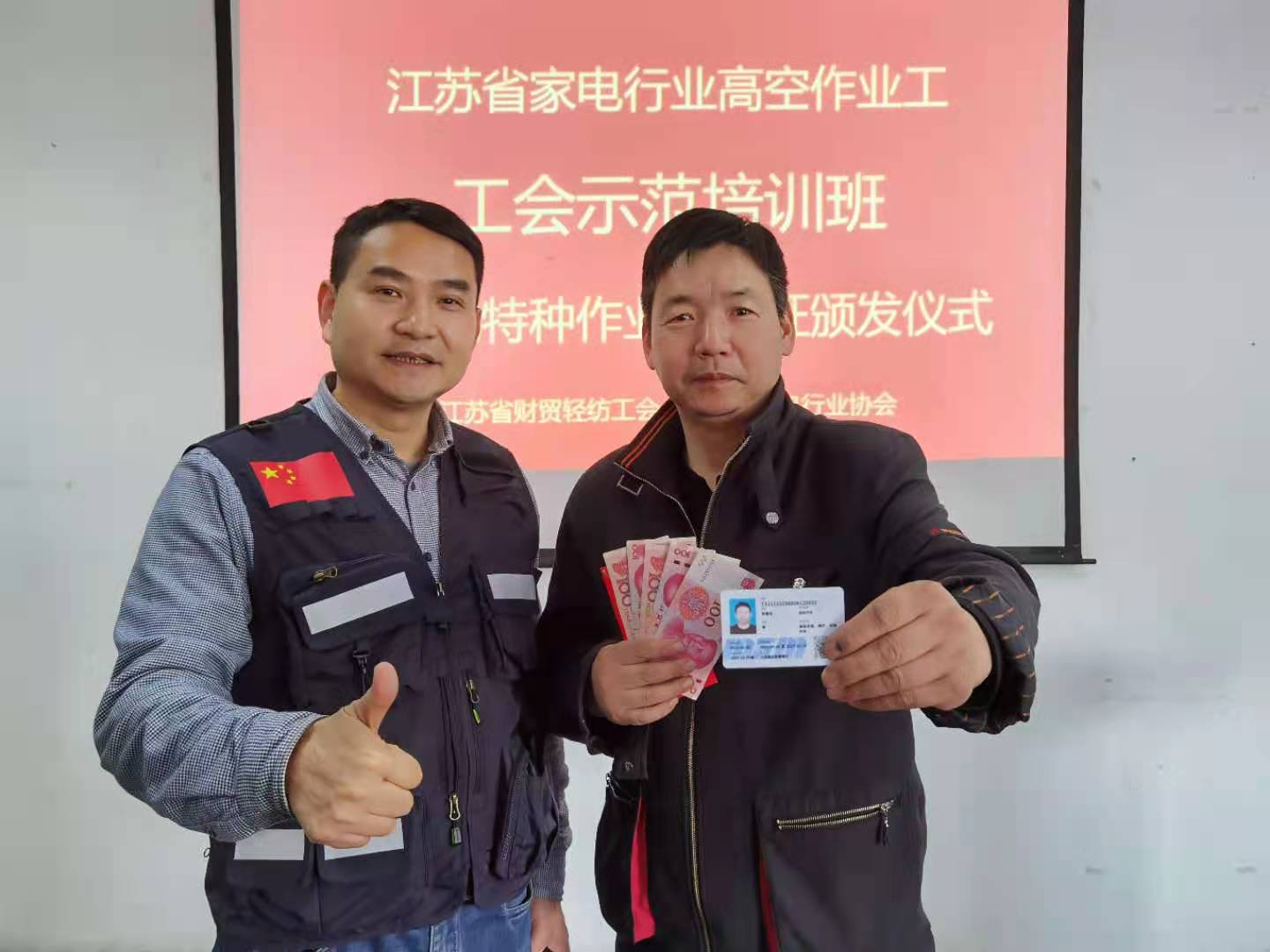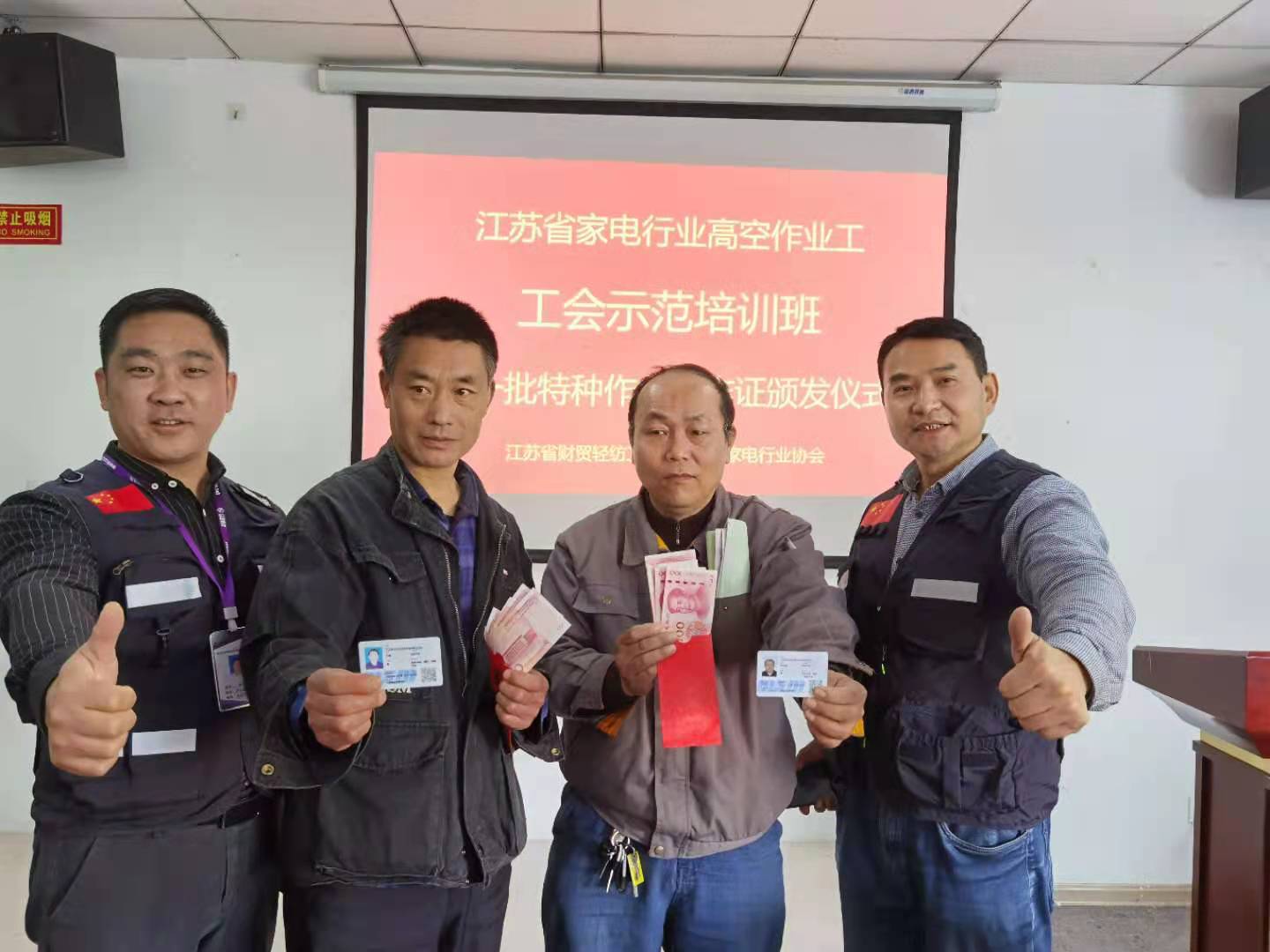 据不完全统计,江苏家电行业有安装维修职工10万人,他们有的需要在高楼大厦间作业,在这部分人群中存在无证上岗,不规范安装操作等现象。其中,高处作业工正面临市场短缺,事故率高发的问题,且社会关注度高,通过“工会示范培训班”落实国家对特种作业人员持证上岗要求,针对高处作业无证上岗、工伤事故多等问题,帮助职工参加系统规范培训,通过国家专业考试,依法取得江苏省应急管理厅颁发的《高处作业证》。