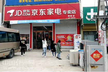 胡少靖在灵璧县禅堂乡禅堂街开的京东家电专卖店,门头右侧是根据当地消费特点搞的旧家电换新活动。