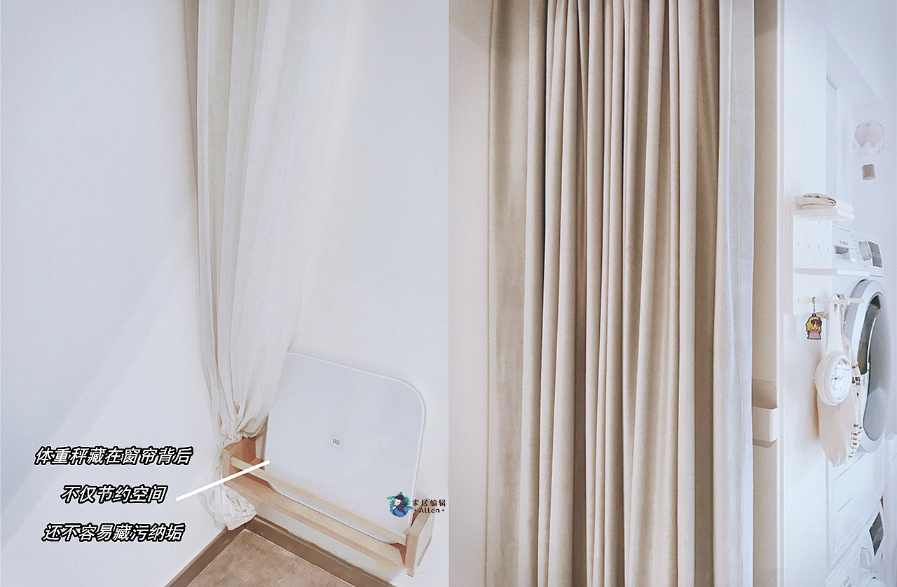 相比之下,上图这招就很实用,在家里窗帘背后的墙面下方安装一个悬空的小木架,大约距地面20cm左右,把体重秤放上去节约空间还减少落灰。便于打扫,拿取方便。