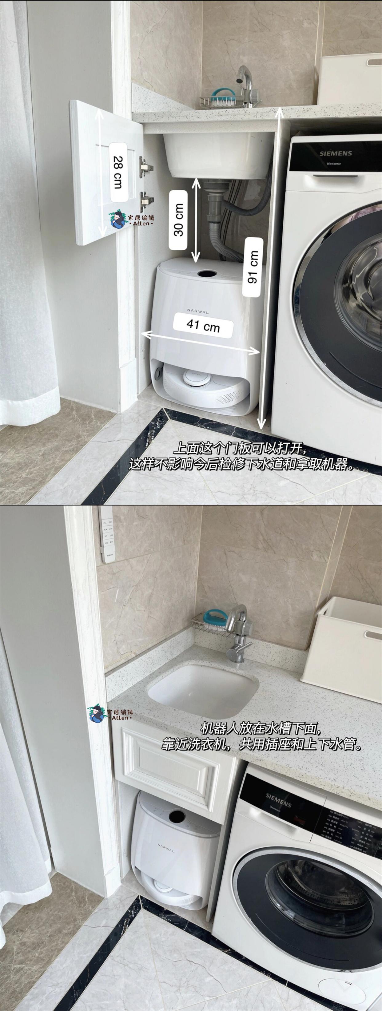像上图这款设计,就正好接入了阳台的进排水,实现了地面清洁全自动化,真正意义上的“去家务了”。