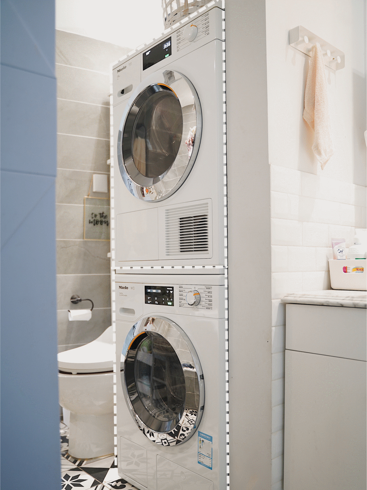 因为旁边就有洗漱台,脏袜子也可以直接手洗。从生活动线的角度来说,洗衣区距离卫生间更近,也极大提升了清洁效率,妥妥地“去家务化”。