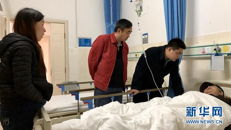工商银行湖北省分行驻来凤县翔凤镇檀木湾村尖刀班成员在医院看望生病住院的贫困户(资料照片)