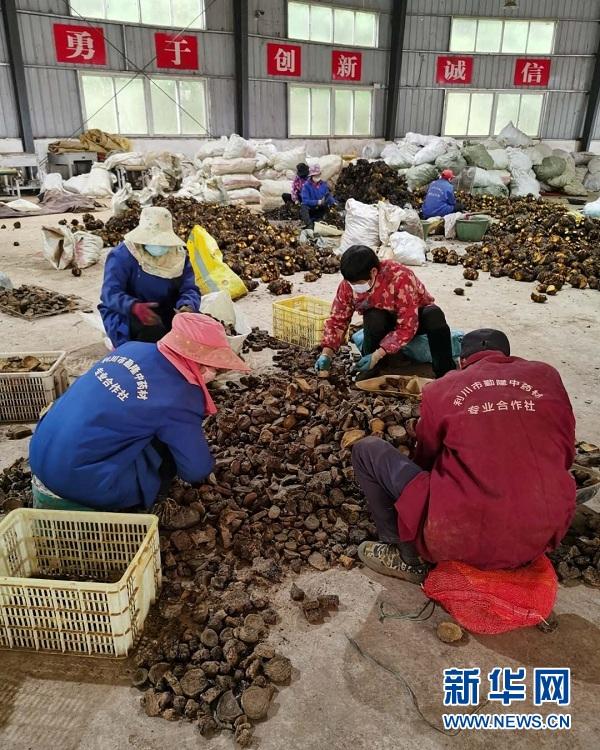 图为利川勤隆中药材专业合作社,村民正在分拣大黄切片。新华网 李征峥摄