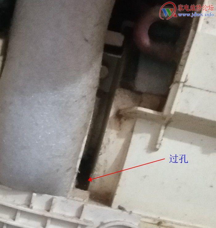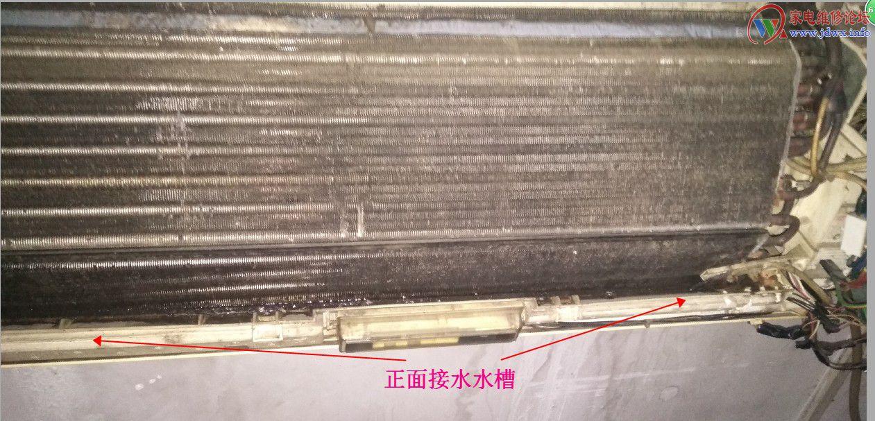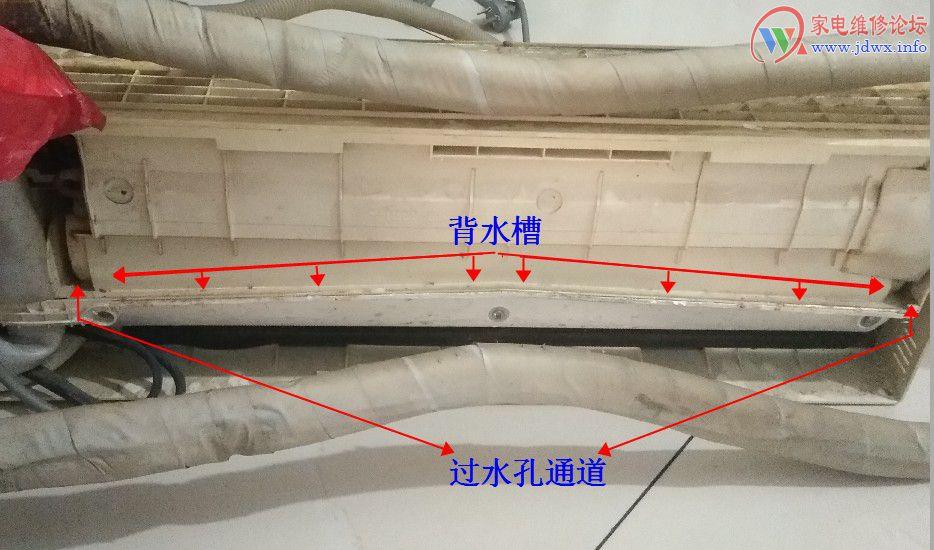 背水槽既空调反面背部的水槽,这个水槽倾斜很浅的。在安装过程中遇到粉块墙壁或者用户搞装修墙渣粉尘类跌落在水槽中导致引水改道。