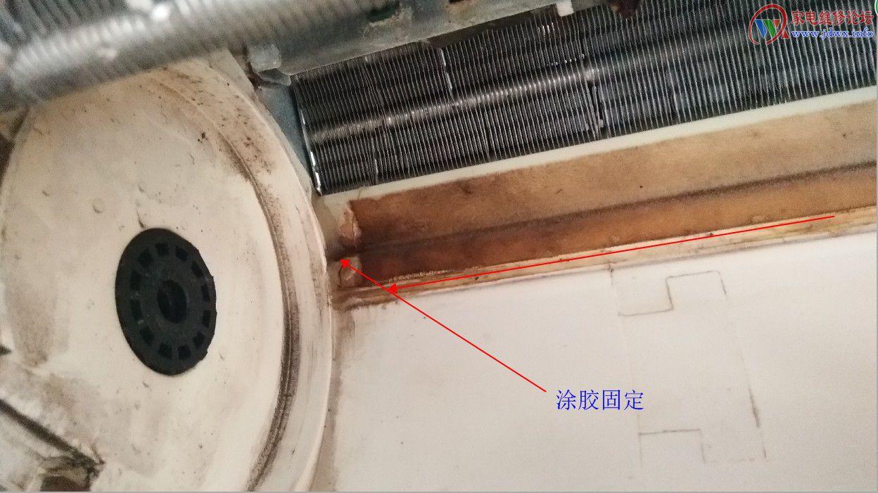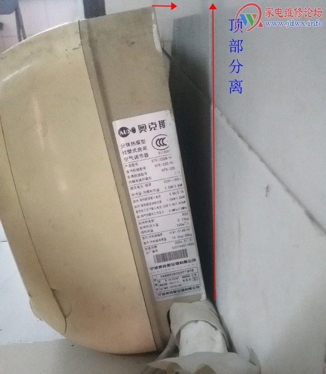 这种故障的主要原因是安装时遇到炉渣砖墙、土砖墙、混凝土墙、空心砖、保温墙、石膏板墙、短钢钉膨胀螺丝导致安装铁皮不牢或者是由于拆机时将扣板顶部的铁皮拔变形导致内机上部分的铁皮扣板与墙壁分离很远或者用户搞卫生时用力过度固定发生脱落,冷凝水从正面水槽溢出来。