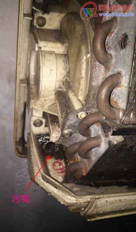 这个故障也是多年的老格力机子,铁皮生锈后拱起粘连在外面塑料托架,水沿着锈迹改变轨道流入壳外。