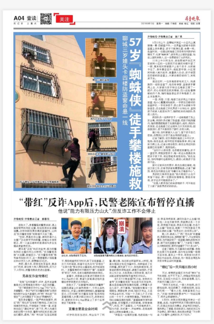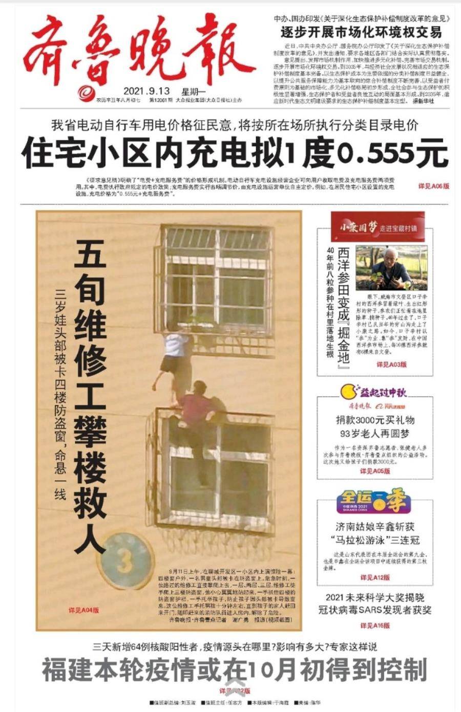 9月11日上午,在聊城开发区一小区内,维修工杨先生在没有任何防护的情况下,徒手爬上四楼的防盗窗,救下被困的三岁男童。救人后,他没有留下姓名。9月13日,齐鲁晚报以《57岁“蜘蛛侠”徒手攀楼施救》为题报道了这感人一幕。阿里巴巴天天正能量联合齐鲁晚报·齐鲁壹点决定为杨先生颁发一万元正能量特别奖,