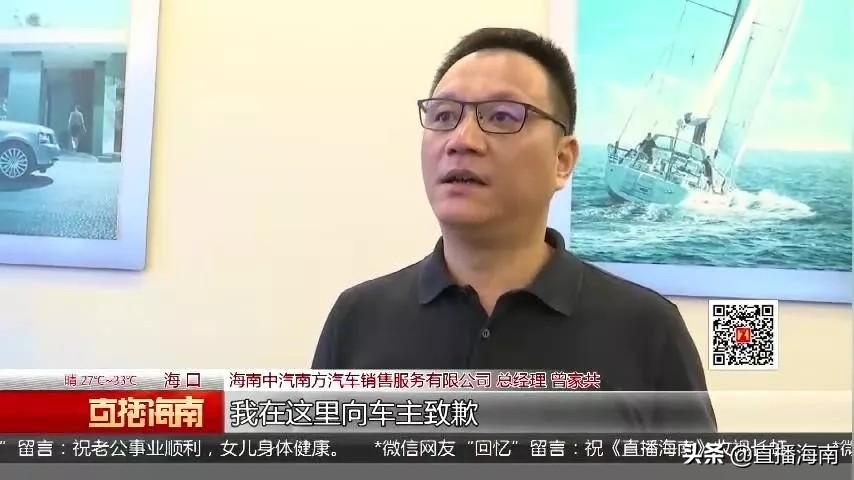 海南中汽南方汽车销售服务有限公司总经理曾家共: 专门针对这件事情,真诚的向我们的车主致歉,我们以后的工作当中,我们会做的更加好,这一次给车主带来的各种不方便,我在这里向车主致歉。