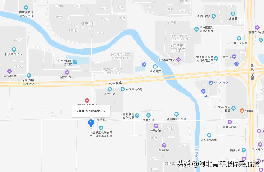 3、 光明路营业厅:七一路与乐凯大街交口西行600米南侧光明路,大唐保定(热电厂)华源热电有限责任公司东门南侧。