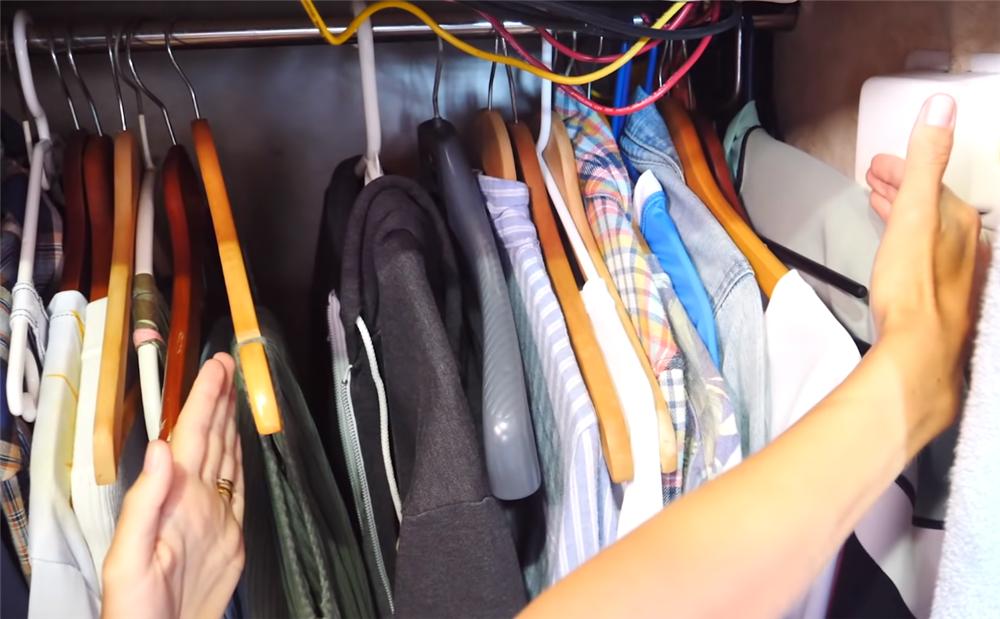 在卧室门的后面,利用这仅有的冗余空间,夫妻俩设计出一个小小的挂衣区,用来收纳平日里常穿的衣服,由于室内空间有限,所以夫妻俩都养成了断舍离的好习惯,每个人常穿的衣服仅有十件左右,完全能收纳得下。