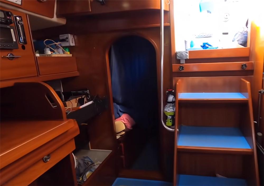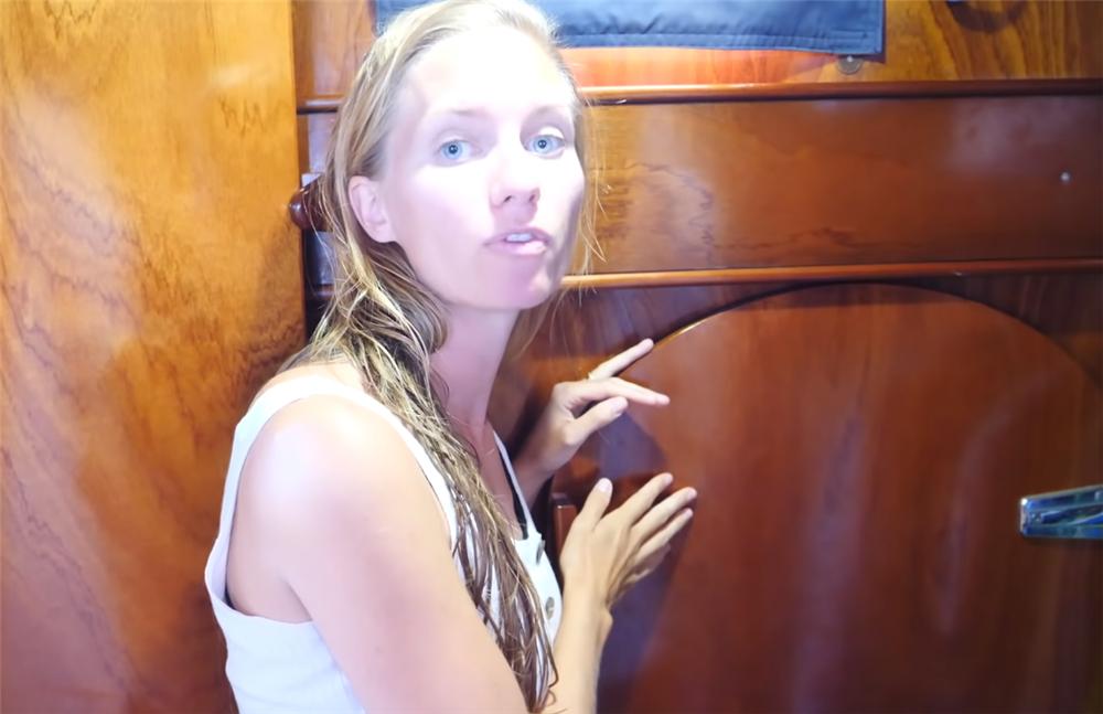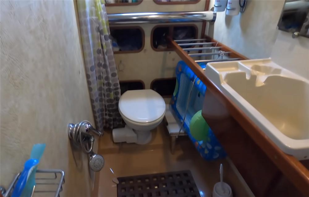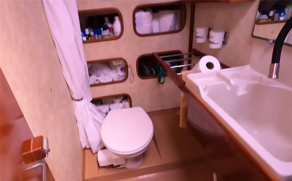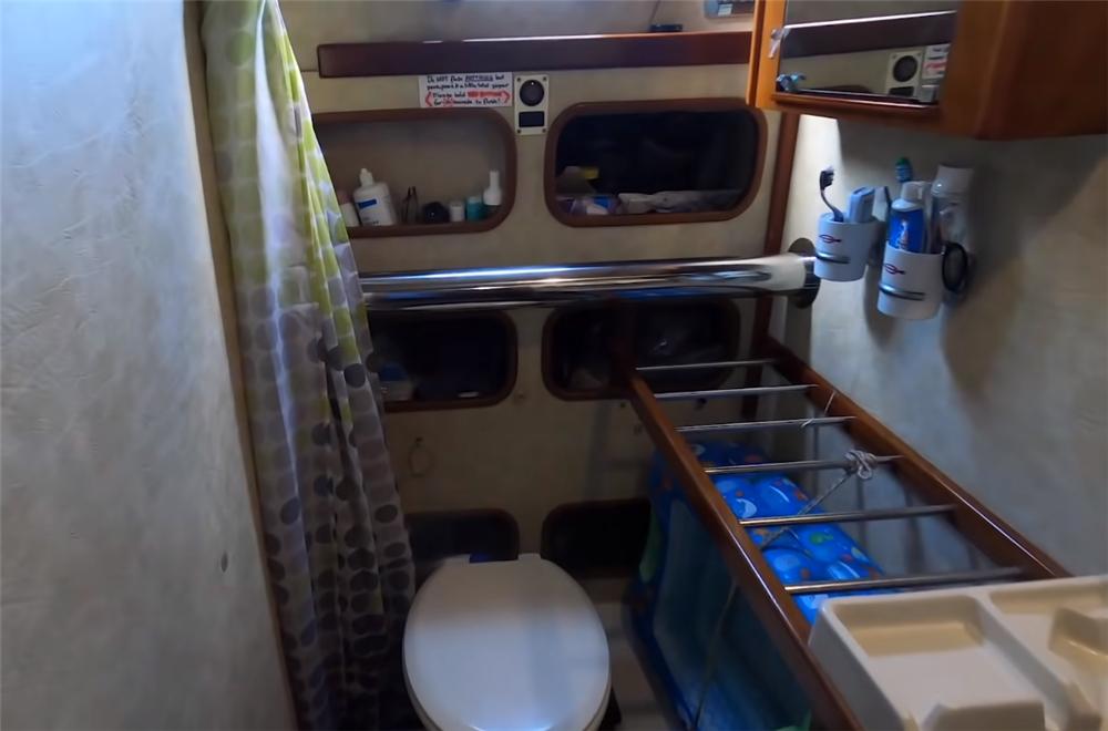 洗澡也完全没有问题,当船上的水量充足时,布里安和卡琳会分开时间段洗澡,围上浴帘,就是一个简单干湿分区后的浴室了。