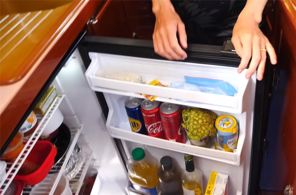 由于家中空间太小,所以就连沙发的坐垫下方,也设计出了一台小小的冷冻柜,平时会收纳一些冷冻食材,当然,布里安偶尔钓到的鱼,也会放入冷冻柜中保鲜。