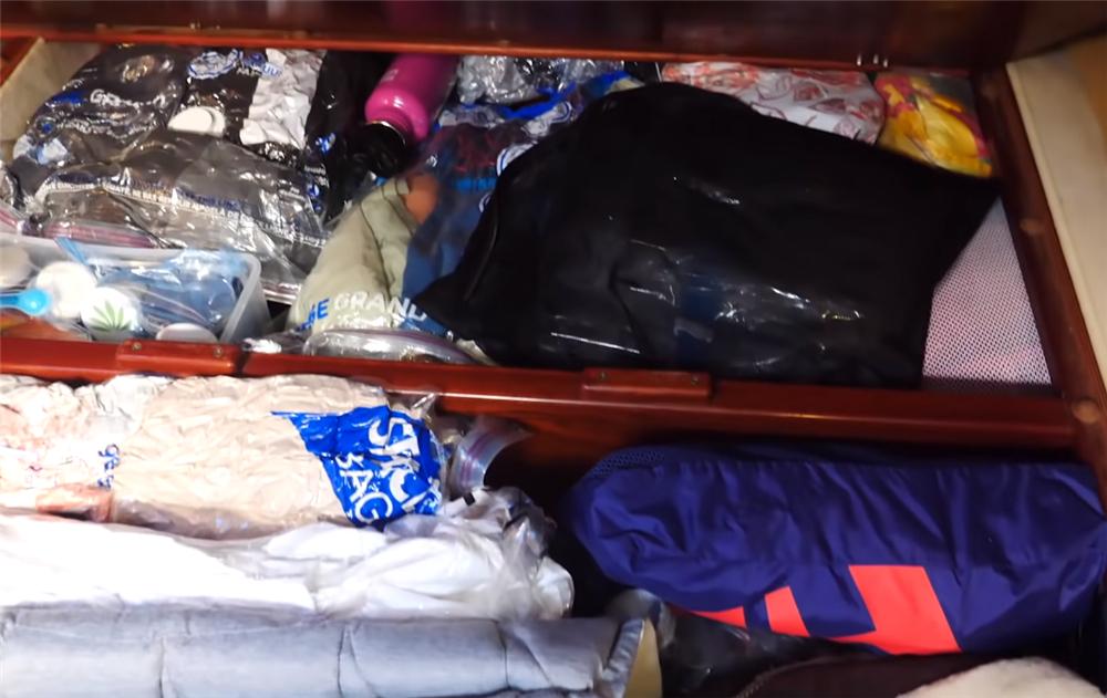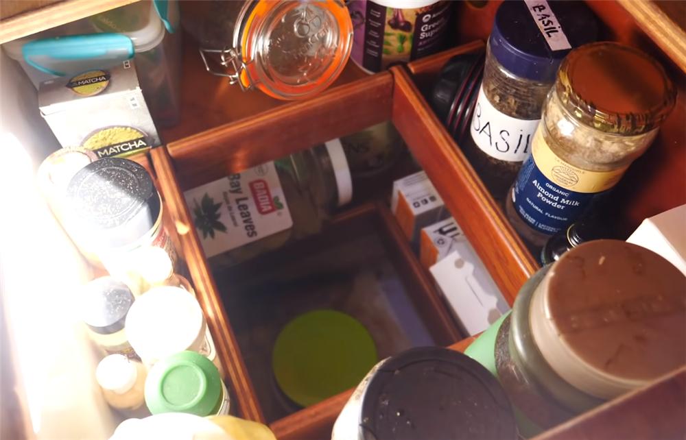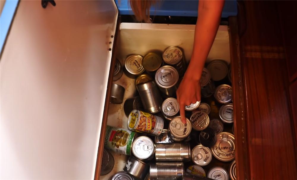卡琳说,远航时,最主要的就是囤积够食物 ,这可以说是每一个航海者的基本常识了;当然,在这对夫妻的小家中,也充分利用起了每一处空间来储存食材。