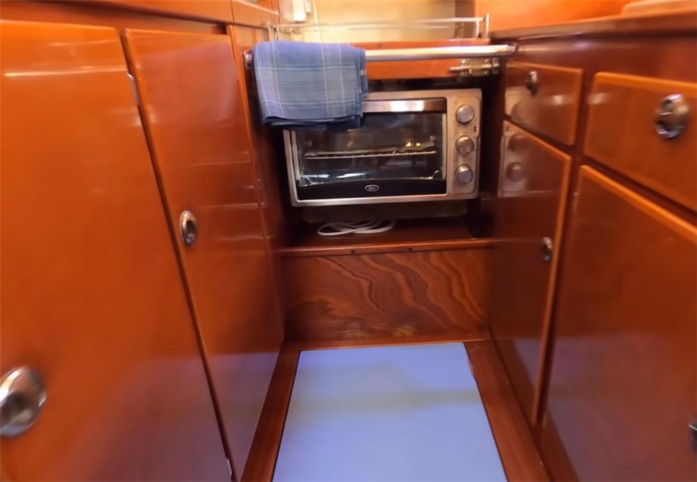 有趣的是,灶台的台面,也设计成了这种可以微微摇晃的设计,像一个小摇篮一样,可抵御海上的风浪,避免在烹饪时洒出食物。