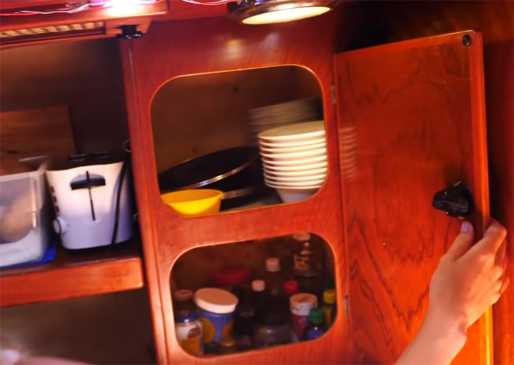 此外,为了防止风浪打翻瓶罐碗碟,所有的橱柜收纳区都带有保护栏杆,柜门也带锁,即便遇上风浪,也不用担心厨房中的餐具掉落。