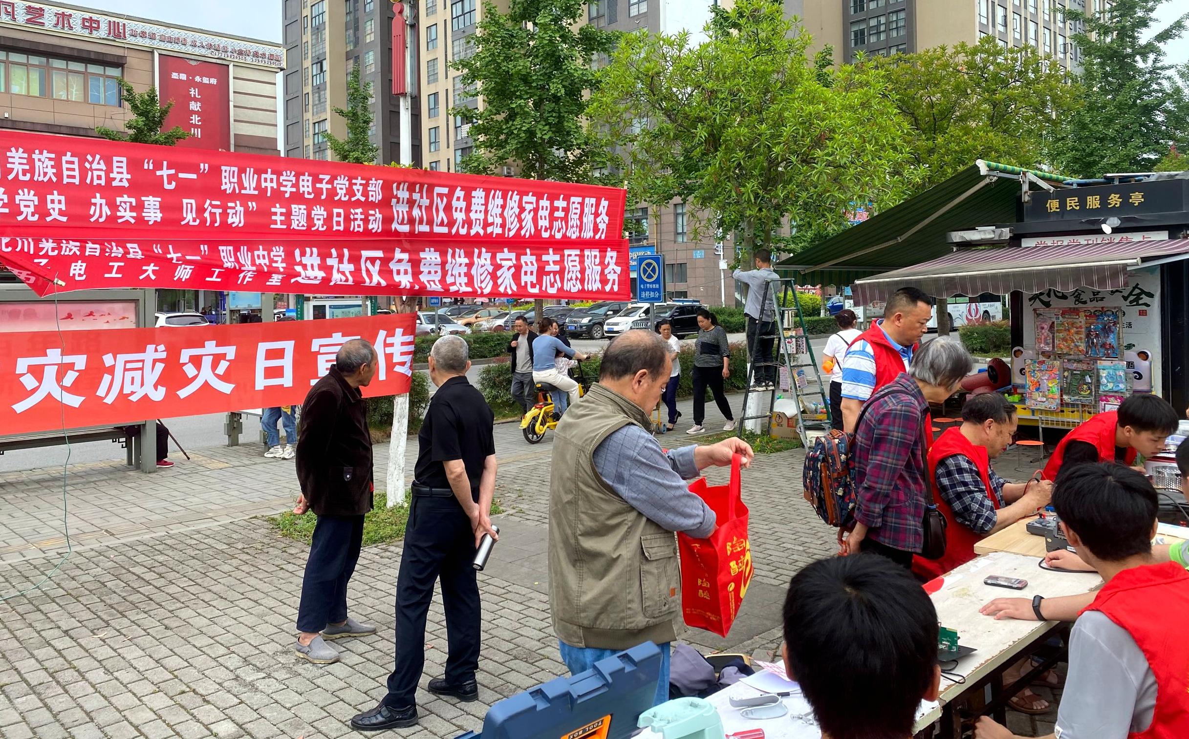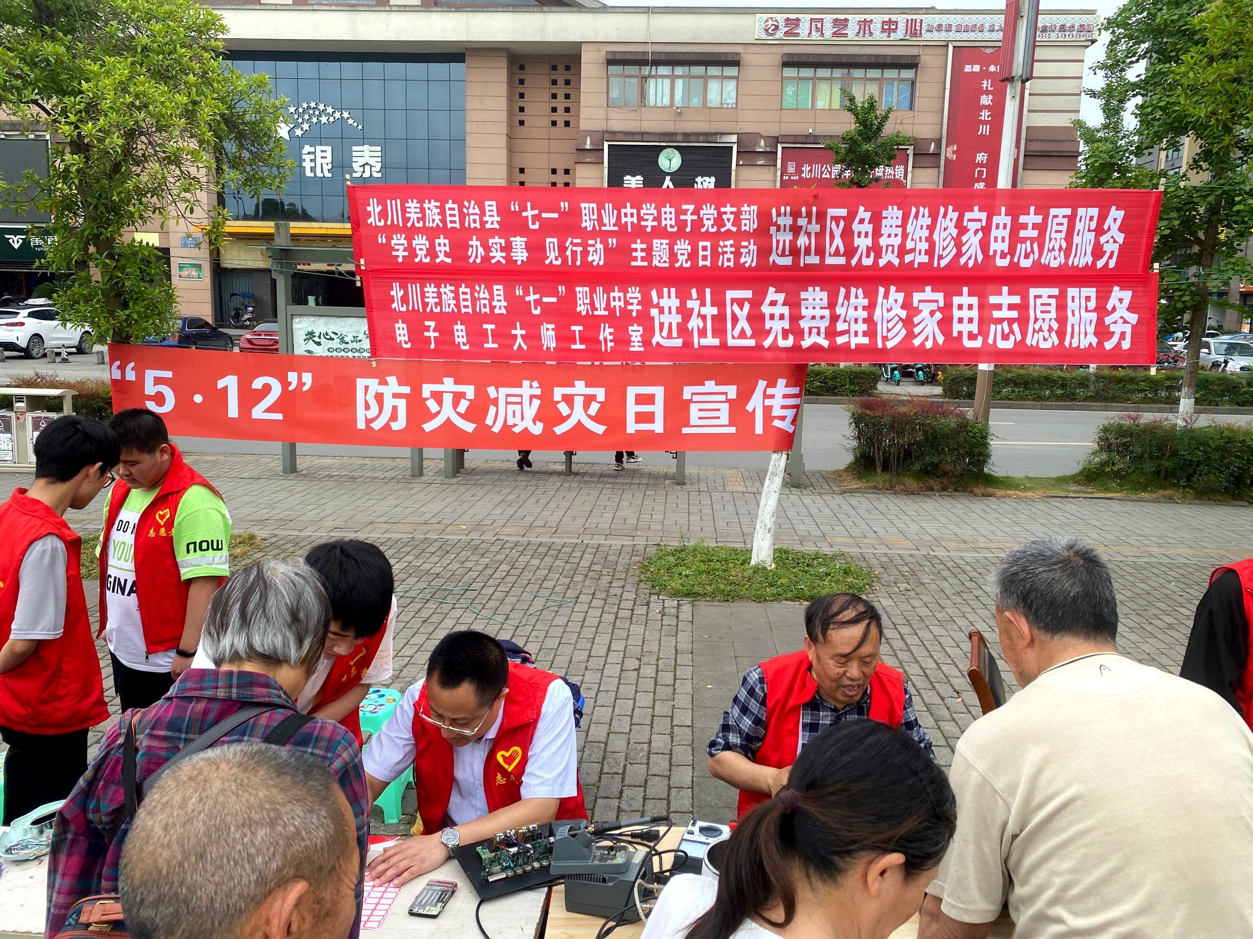 5月12日,北川羌族自治县七一职业中学电子党支部在永昌镇禹龙广场开展 “学党史、办实事、见行动”主题党日活动。本次活动由电子党支部党员志愿者代表、学生志愿者代表为禹龙小区、尔玛小区居民提供免费检测家电及维修服务。