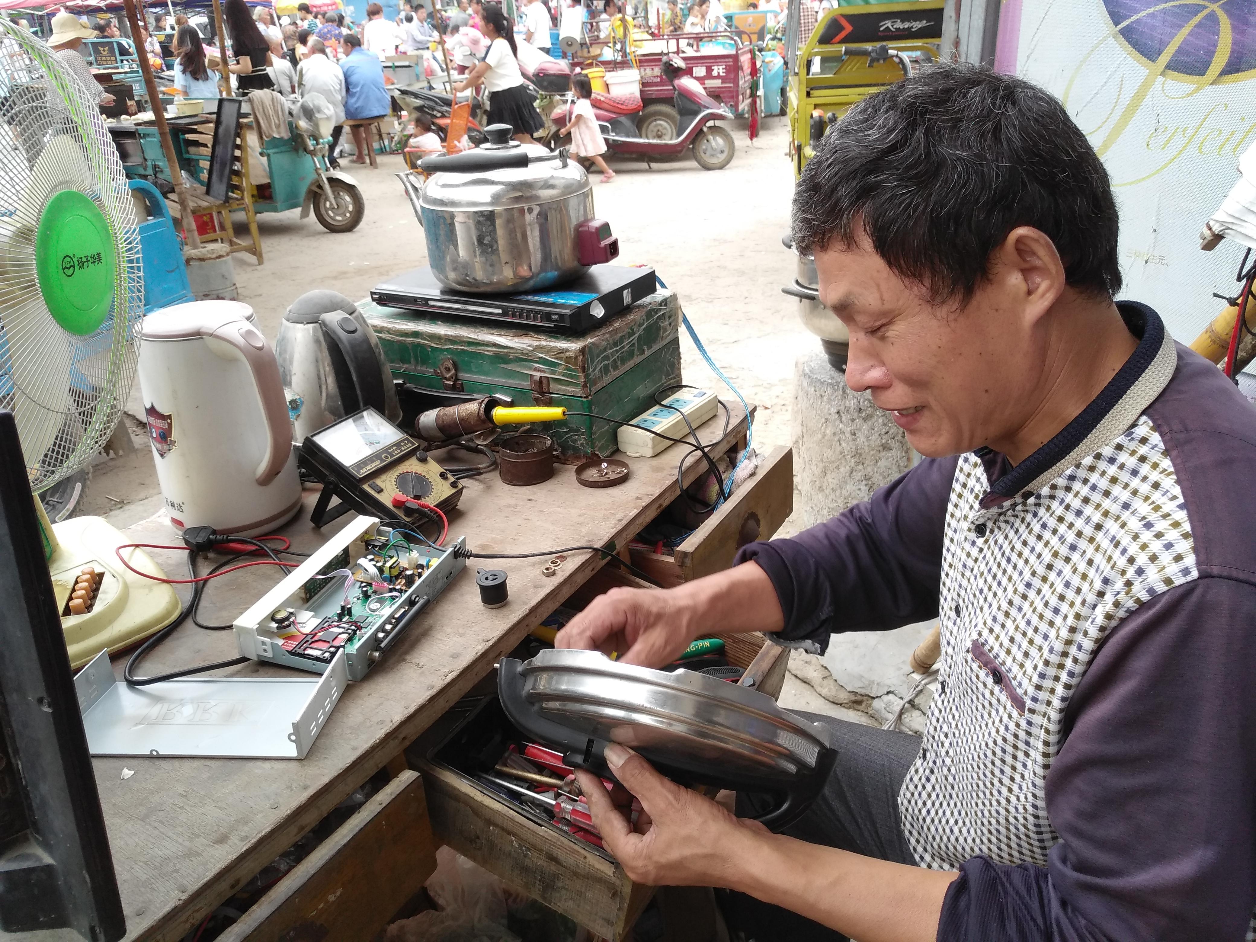 高皇南头十字街的西南角就是黄朝锋经常维修家电的地方,每到逢集,他就一大早把摊位摆好,等待客户来维修电器。“黄朝锋师傅的技术在高皇街上是数一数二的,一般的家电毛病像电视机、洗衣机、电风扇等只要到他手里,可以说是手到病除。”一位正在修理家用电器的农民说道。