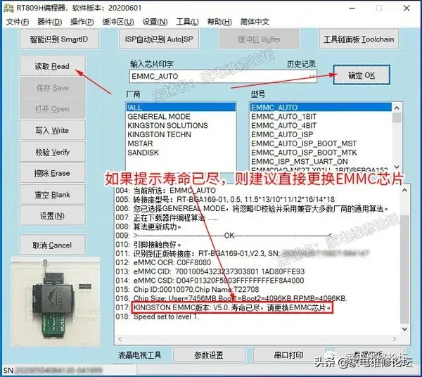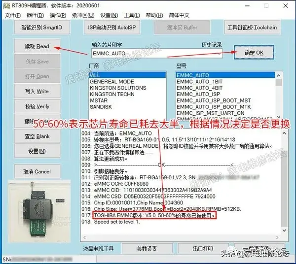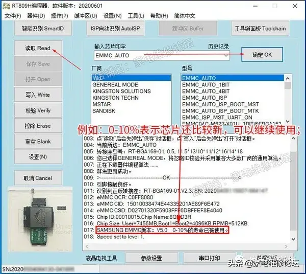 RT809H编程器新增EMMC使用寿命显示和EMMC芯片版本判断
