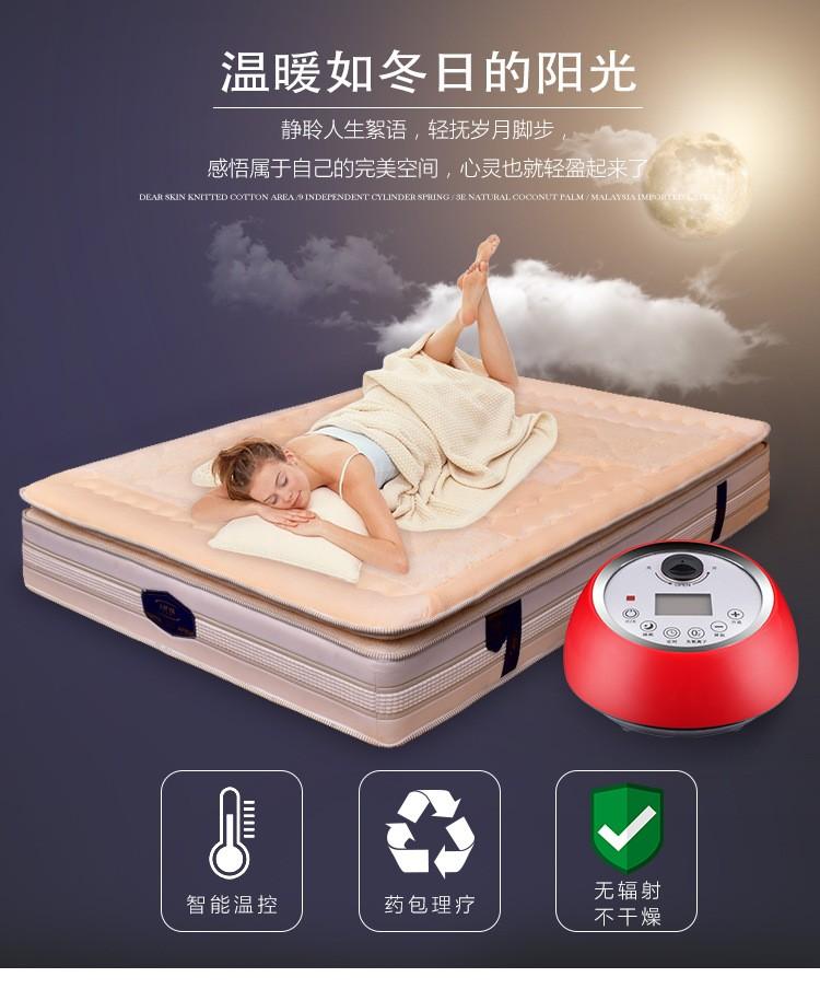 水暖床垫又称温控水暖床垫,由水暖床垫和储水器两部分组成,工作原理是通过储水器将水加热,再由潜水泵输送到水暖床垫来进行人体取暖。这种产品在发热过程中以水为介质,无漏电和火灾隐患,还不会产生任何电磁辐射。夏天使用其制冷功能,床垫凉爽舒适,可以避免因吹空调或吹风扇引发的头痛、胸闷、筋骨关节痛、四肢乏力等问题;冬天使用其加热功能,床垫内充满热水但却不干燥,尤其对风湿腰腿痛、胃痛等病症还有热敷解痛的辅助功效,其主机磁化系统可使水产生磁场效应,可缓解身体压力,改善睡眠质量。