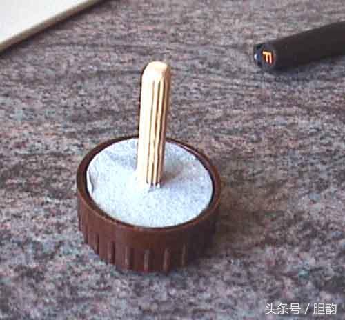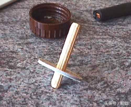 制作好了套在瓶盖上试验一下,一定要保证小木棒在瓶盖正中