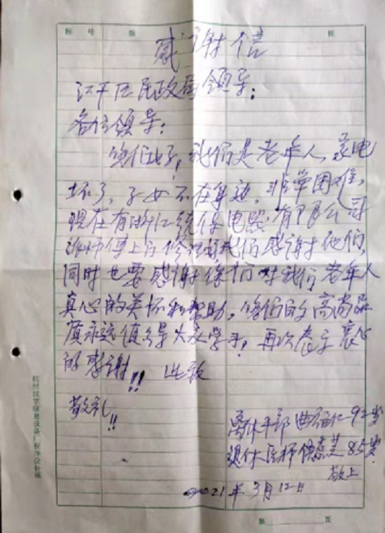 一个电话就有人上门免费维修家电 江干92岁老人手写感谢信点赞