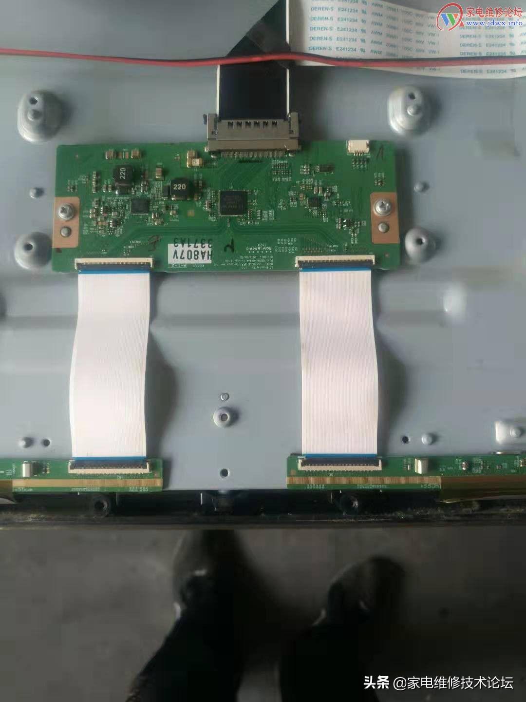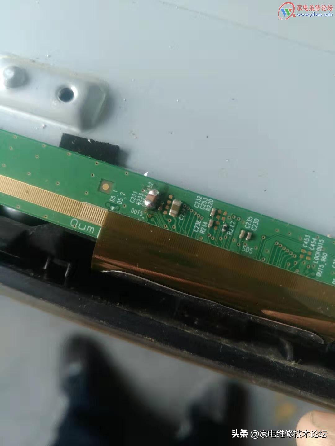 今接收一台康佳LED55F5570NF液晶电视机,用户讲开机看了十几分钟就没有图像了,插电开机有开机声,屏微兰无图像背光亮,打开电视机此机是三合一控制板,测各个电压正常,测逻辑板有12v电压,无VHG和VHL电压,判断是逻辑板和屏的问题,随断开逻辑板和屏的双排线,VHG电压27v,VHL电压负的5.6v正常,接通左边排线,断开右面排线,屏左面有图像,右面白屏故障缩小到屏和右面边板,先测量边板电容对地短路,逐个断开各电容测量当断开软排2电容时短路消除,测量该电容已经短路,换好电容开机一切正常,图像良好试机3小时无问题修复。(作者:青州维修/家电维修论坛www.jdwx.info)