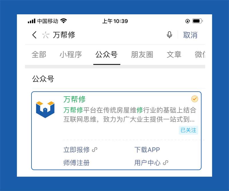 搜索“万帮修” 一键报单,平台智能为您匹配优质维修师傅到家服务
