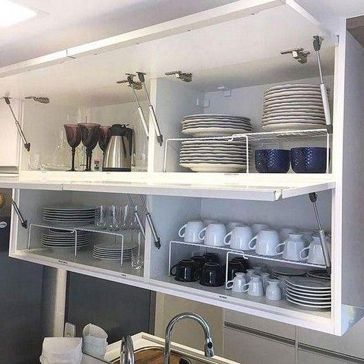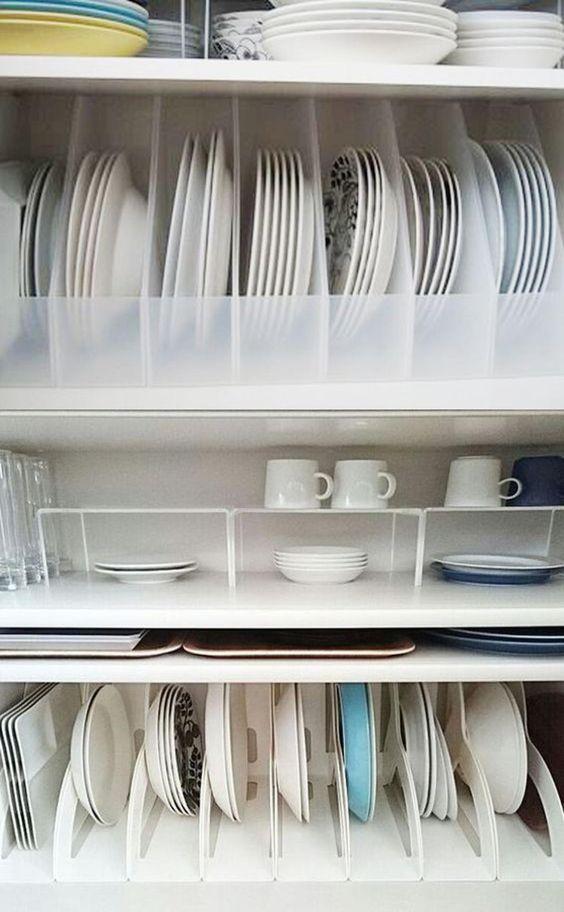 为了方便拿取,放在橱柜上方的收纳盒最好要带拉手。如果你的橱柜没有柜门,可选择带盖的收纳盒。反之,选择无盖的既可。如果放置餐盘,可选购可拉伸的餐盘收纳架,如下图所示。