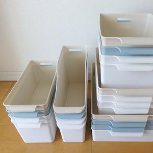 1、收纳筐 :这里指的是无盖的收纳筐,建议选择透明、白色、米色或灰色的塑料收纳筐,视觉上干净整洁,且方便清洗,不易受潮。