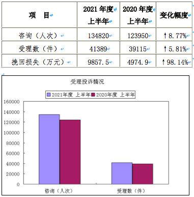 2021年上半年,南京市消协组织共接受消费者来访、来电咨询134820人次,处理各类消费投诉41389件。按投诉类别分,投诉量前三名的商品项目为家用电器、一般食品和家居用品。投诉量前三名的服务项目为餐饮和住宿服务、美容美发洗浴、文化娱乐体育服务。与2020年上半年数据相比,咨询人次、受理件数都有所增加。