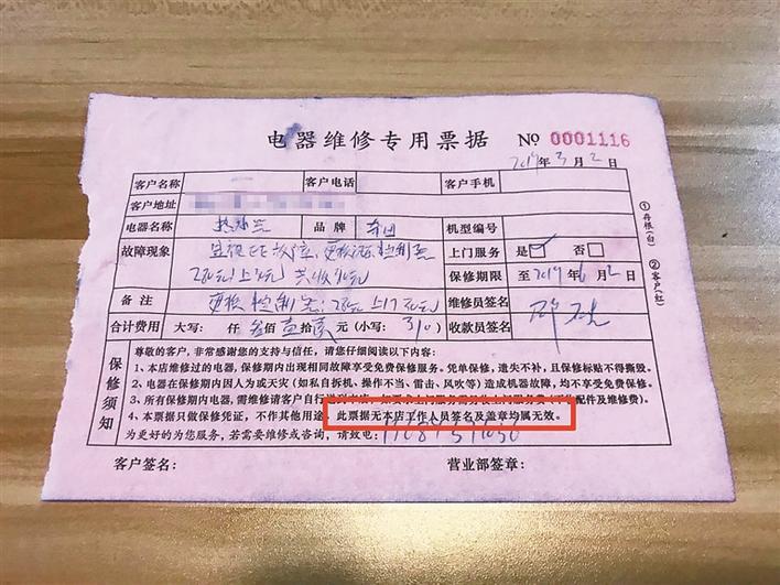 " 您是不是奇田的维修人员?"" 我能帮你修好就行啦 "。维修人员现场手写了一张收据,让陈先生纳闷的是,这名维修人员不仅没有工作证明,所开收据也没有盖章,而这张名为《电器维修专用票据》上的保修须知明明写着 " 此票据无本店工作人员签名及盖章均属无效 "。