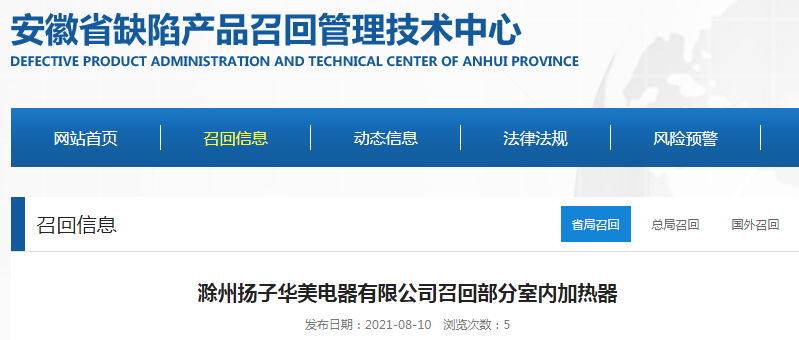 「安徽」滁州扬子华美电器有限公司召回部分室内加热器
